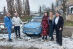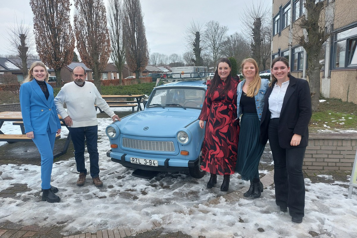 Ter afsluiting van de Open Dag wilde de leraar Duits met zijn collega’s graag op de foto bij de Trabant. Men spreekt van een geslaagde Open Dag.
